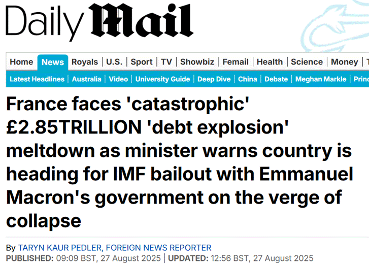 France teeters on the edge of fiscal and political collapse, with soaring debt, rising borrowing costs, and a desperate president potentially ready to seize dictatorial powers as the IMF looms on the horizon.