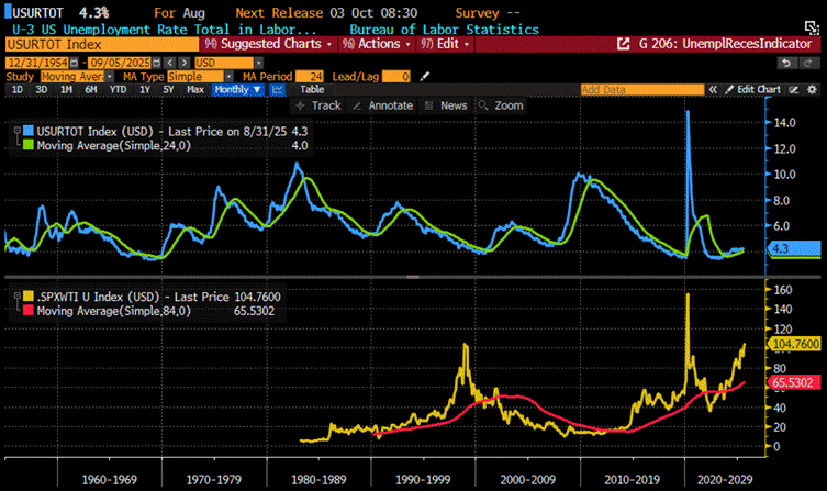 Upper Panel: US Unemployment Rate (blue line); US Unemployment 24 months moving average (green line); Lower Panel: S&P 500 to WTI ratio (yellow line); US S&P 500 to WTI Ratio 84 months moving average (red line).