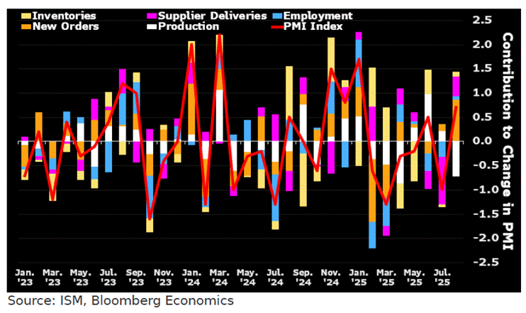 After a “Labour Day hibernation’, Donald Copperfield magically popped out of his golf course just in time to see ISM Manufacturing PMI tick up to 48.7 in August, a touch below expectations. New orders did the heavy lifting, inventories ran low, and suppliers slowed down — basically the same old song. Production lagged, jobs slipped (but not as badly), and prices cooled ever so slightly.
