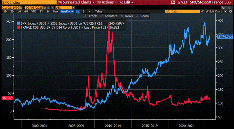 Relative performance of S&P 500 index to Euro Stoxx 50 Index (blue line); France 5-Year CDS (red line).