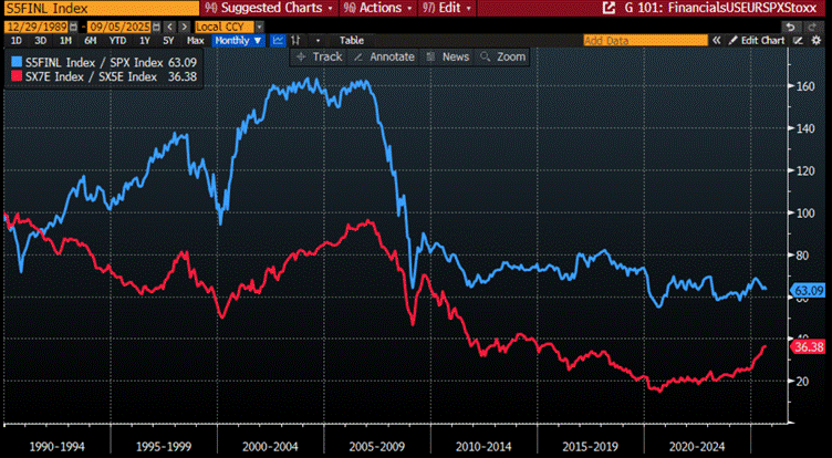 Relative performance of S&P 500 Financials Index to S&P 500 Index (blue line); Euro Stoxx Bank Index to Euro Stoxx 50 index (red line).