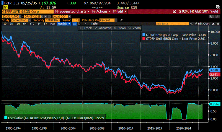 France 10-Year Yield (blue line); Germany 10-Year Yield (red line) & Correlation since 1990.