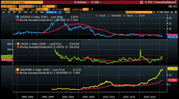 As of September 5th, 2025, the figures, unlike the ministries, cannot lie. France drifts in its engineered boom, the CAC-to-oil and gold-to-bond ratios paraded like banners of prosperity, yet the CAC-to-gold ratio has collapsed since October 2021—a silent record of Germany’s four-year dream inside a monetary hallucination. The ECB, Paris, and Brussels, guardians of the Ministry of Finance-Truth, tinker endlessly to preserve the illusion that debt is wealth and inflation is growth. But all illusions decay. Every boom is designed to end in bust, every pageantry of numbers conceals a reckoning. And should the war hawks succeed in their fabrication, the false flag will become the trigger: the inflationary masquerade will not fade tomorrow, it will collapse today.