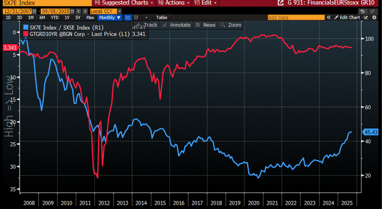 Relative Performance of Euro Stoxx Bank Index to Euro Stoxx 50 Index (blue line); Greece 10-Year Yield (Axis Inverted; red line).