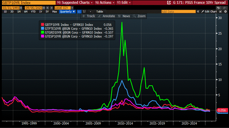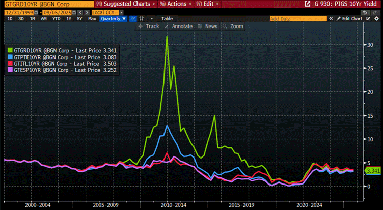 By September 2025, the European Union—run by reckless Keynesians pushing a Malthusian agenda of wars, scarcity, and control—is hurtling toward a major sovereign debt crisis. This collapse threatens to dismantle the EU itself, the very symbol of globalism, whose policies are drafted by unelected bureaucrats to serve a plutocratic elite entrenched in the Brussels swamp. Nobody needs to be a fixed income fund manager to notice that long-dated yields in major EU countries like Germany and France have been structurally rising since the start of the decade—a direct reflection of the acceleration of the globalist agenda, justified under the twin pretexts of the COVID ‘plandemic’ and the theatrics of “green” policies invented by politicians playing Dr. Jekyll and their Green Zealot doubles.