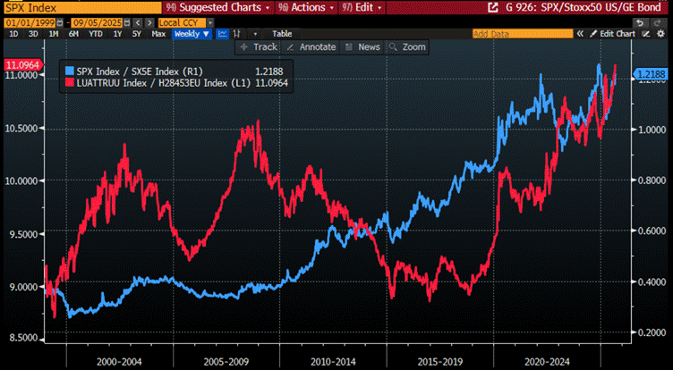 Relative performance of S&P 500 index to Euro Stoxx 50 Index (blue line); Relative performance of the Bloomberg US Treasury Index to the Bloomberg Germany Treasury Bond Index (red line).