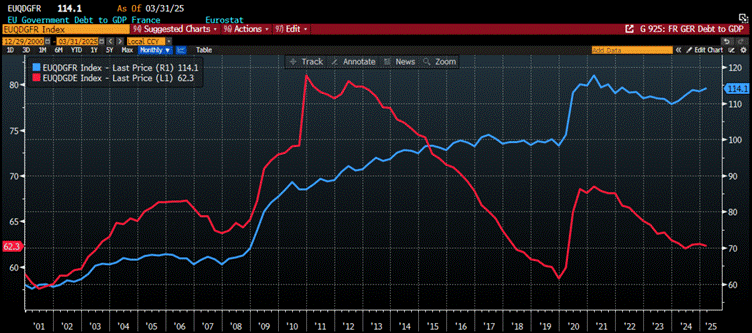 France Debt to GDP (blue line); Germany Debt to GDP (red line).