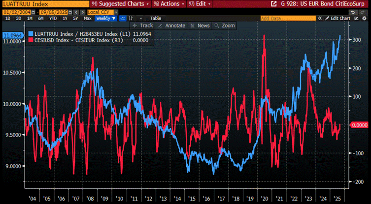 At the end of the day, FX investing—like most investment—is essentially a beauty contest: the “less ugly” candidate outperforms the one that looks worse. What drives the relative performance of bond markets, and ultimately currencies, is how economic data appears at a given point in time. In this regard, the Citi US Economic Surprise Index versus the Citi Euro Economic Surprise Index has proven to be a reliable indicator of trends in both bond market performance and FX exchange rates.
