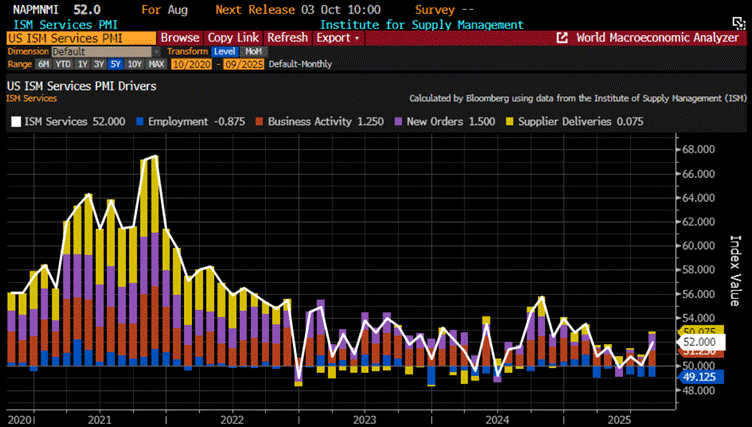 US Services activity perked up in August — thank you, data centres and the great sport of tariff front-running. The ISM Services PMI jumped to 52.0 from 50.1, with new orders at their fastest pace since October. Of course, backlogs shrank, prices stayed painfully high, and employment kept contracting. Translation: business looks “better,” but mostly because firms are rushing to beat tariffs while quietly admitting they can’t keep eating the costs. Call it growth with a side of inflation, served lukewarm or an inevitable stagflation ahead.