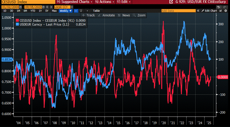 USD/EUR FX Rate (blue line); Spread between Citi US Economic Surprise Index and Citi EUR Economic Surprise Index (red line).
