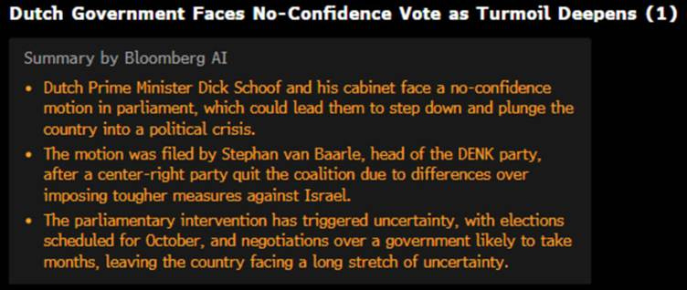 Further north, the Netherlands isn’t faring much better. After the ‘Gouda Warmonger’ traded The Hague for a cushy seat at the North Atlantic Terror Organization, the patchwork coalition he left behind is already unravelling—because even duct tape politics can’t hide a collapsing economy.