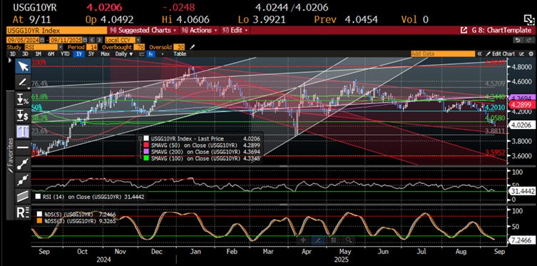 Despite Chapter 2 of the Great Reflation Saga looming, the 10-year yield is still stuck near 4.0%, as Wall Street’s finest cling to the fairy tale that the “risk-free” asset will stay risk-free when Trump Stagflation crash the party.