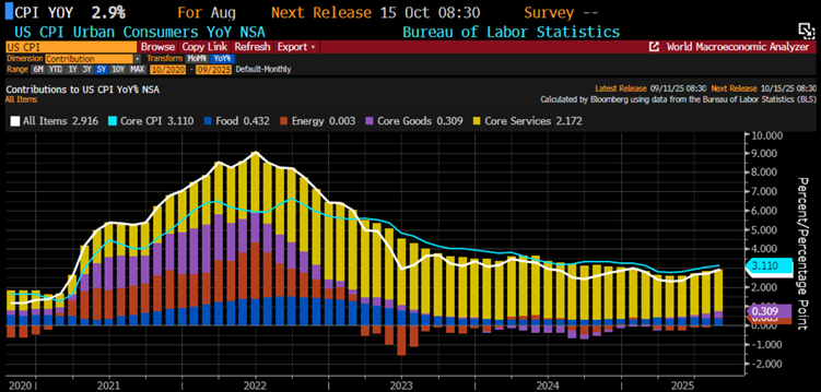 The eighth CPI print of this so-called Jubilee Year strutted onto the stage with a +0.4% MoM—slightly hotter than July’s +0.3% and the +0.3% economists had dutifully scribbled into their spreadsheets. Year-on-year inflation put on its best soap opera face at +2.9%, exactly on cue with forecasts, but still juicier than last month’s 2.7%. Energy, of course, played the diva role (thank you, oil) to keep the “deflation” fairytale breathing, while goods inflation came roaring back with its spiciest YoY act since May 2023. Food joined the fun too, delivering its biggest yearly surge since October 2023. And core services? They took a coffee break, slowing ever so slightly from +2.2% to +2.17%—a blink-and-you-miss-it deceleration worthy of May’s reruns.