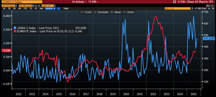 Chaos Index (US Economic Policy Uncertainty Index + Caldara Iacoviello Geopolitical Risk (GPR) Uncertainty Daily ) (blue line); US CPI Electricity YoY Change (red line).
