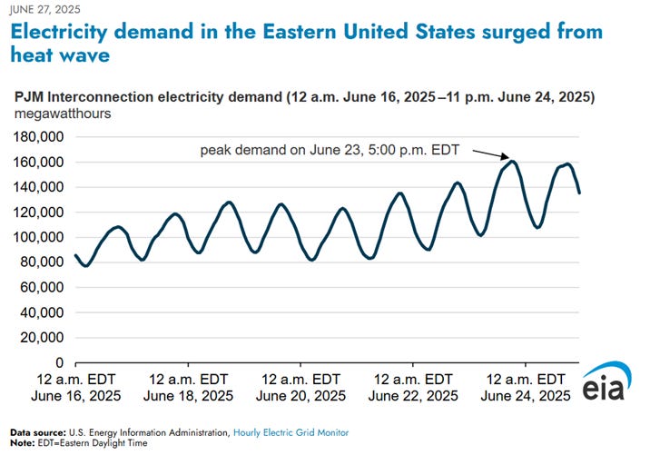 Extreme weather events, particularly the record-breaking July 2025 heat waves, have further strained U.S. electricity markets. A “heat dome” drove national peak demand to 758,149 MWh in a single hour, forcing utilities to purchase expensive spot-market power to meet air conditioning loads—costs passed on to consumers. The Southwest and Southeast were hardest hit, with households and businesses facing double-digit increases in monthly bills.