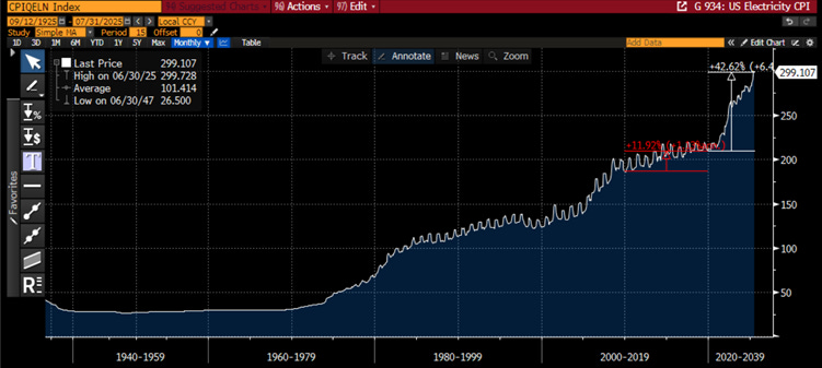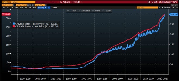 Sure, AI is gobbling up electricity like a teenager with free snacks, but let’s not forget the human touch in this chaos. Malthusian policymakers, obsessed with control, have let the U.S. lag in infrastructure investments—especially the electric grid, the backbone of a healthy economy and broad prosperity. Meanwhile, Wall Street keeps cashing in, regardless of whether the Oval Office occupant is rocking blue or red. So, no surprises here: U.S. Electricity CPI and the “Chaos Index”—a delightful cocktail of policy blunders and global tensions—are dancing in perfect sync. Translation? Expect to pay more for less, with a generous helping of political theatre on the side.