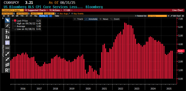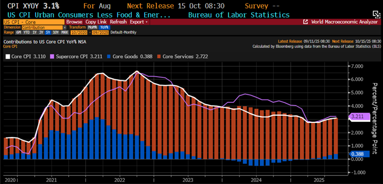 Core CPI in August arrived right on script at +0.3% MoM—steady as July, and exactly what forecasters ordered. On a YoY basis, it held at 3.1%, basically pressing pause after June’s little reacceleration. Core services—making up a whopping 76% of the inflation buffet—eased to 2.72% YoY, while core goods stayed stubbornly inflationary for the fifth straight month. And yes, we’re now on month 63 of uninterrupted core CPI gains. But relax—only economists, investors, central bankers, and anyone who eats, drives, or breathes need to care.