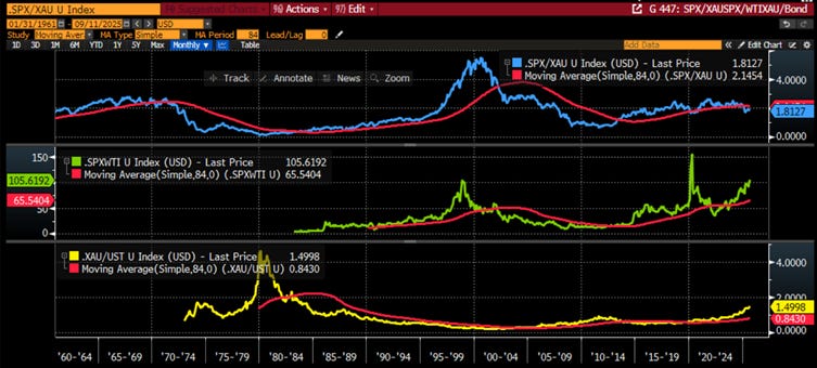 Energy—the boring little footnote in every GDP report that secretly runs the entire economy. But who cares about physics when Wall Street cheerleaders and Keynesian fairy tales insist the business cycle is just a vibe? Real investors—those not hypnotized by central bank pixie dust—already know that tracking a stock index to oil prices (local currency, naturally) tells you exactly where we are. Above the 7-year average? Party time. Below? Grab a helmet.