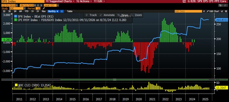 Spread between US Core CPI & US Core PPI (Histogram); S&P 500 12-months Forward EPS (blue line); 12-month S&P 500 returns (lower panel; yellow histogram).